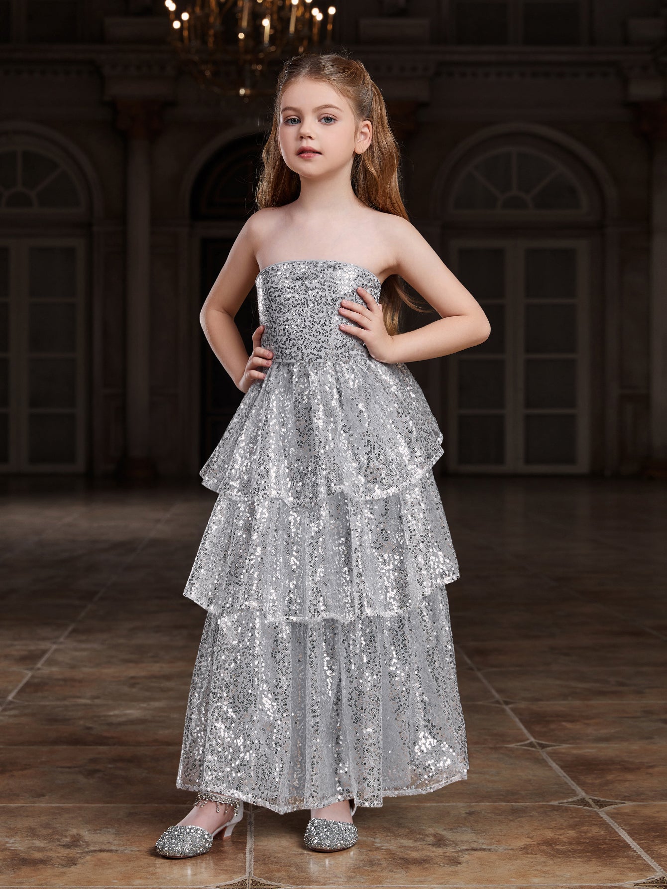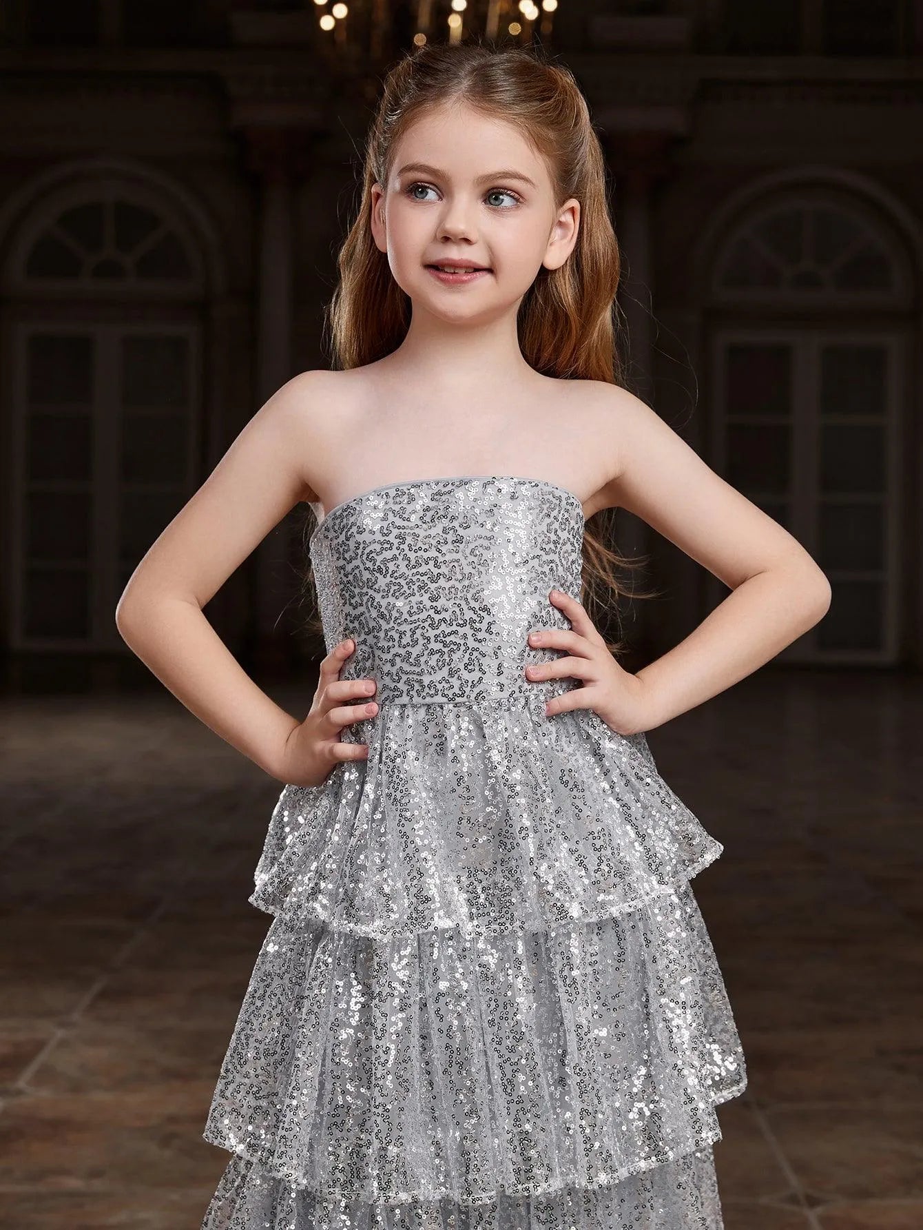 This dazzling silver strapless gown is perfect for making your little one shine at any special event. The gown features a fully sequined bodice that catches the light beautifully, creating a stunning sparkle. The tiered skirt adds volume and elegance, allowing for graceful movement. Crafted from high-quality materials, this dress ensures both comfort and durability. Ideal for weddings, parties, and formal occasions, this silver gown is designed to make your child feel like a star. Let her twirl and sparkle in this exquisite and eye-catching dress.