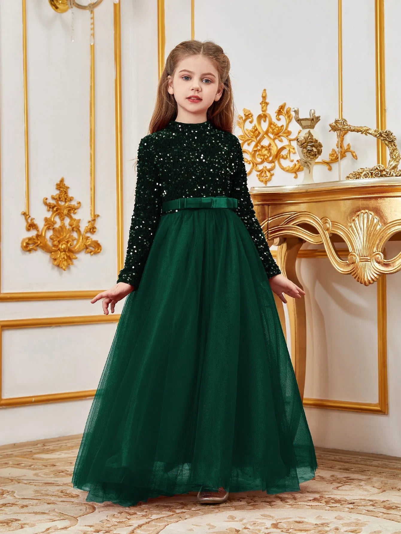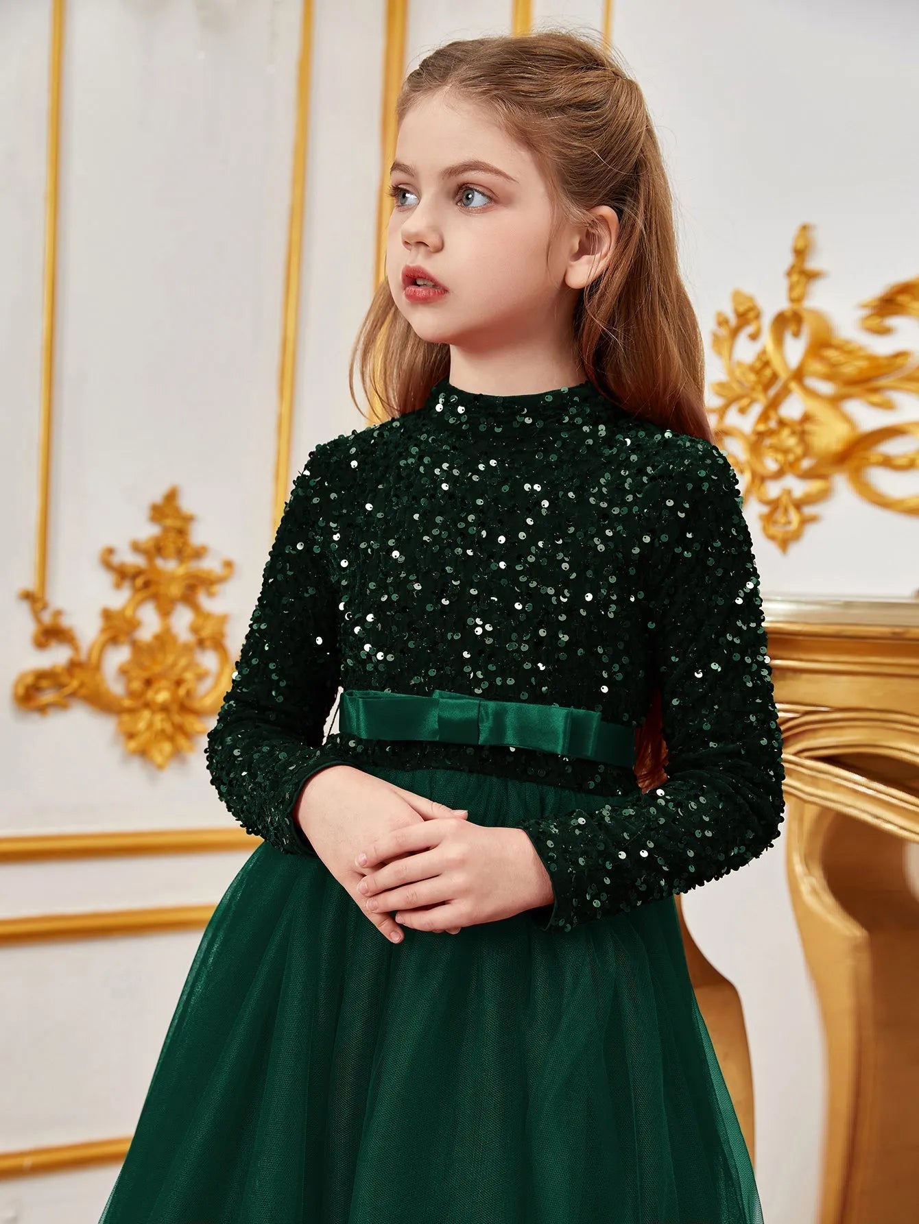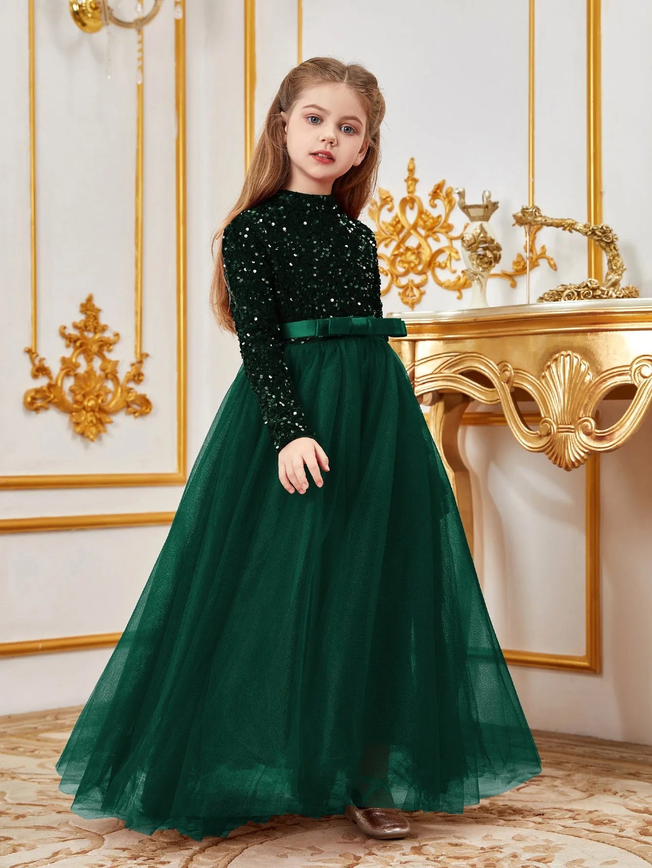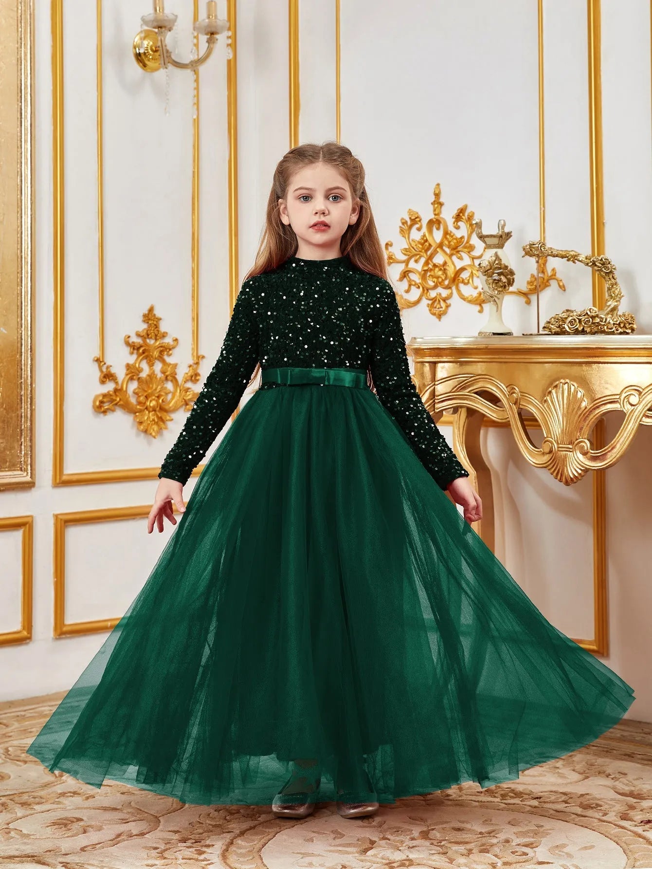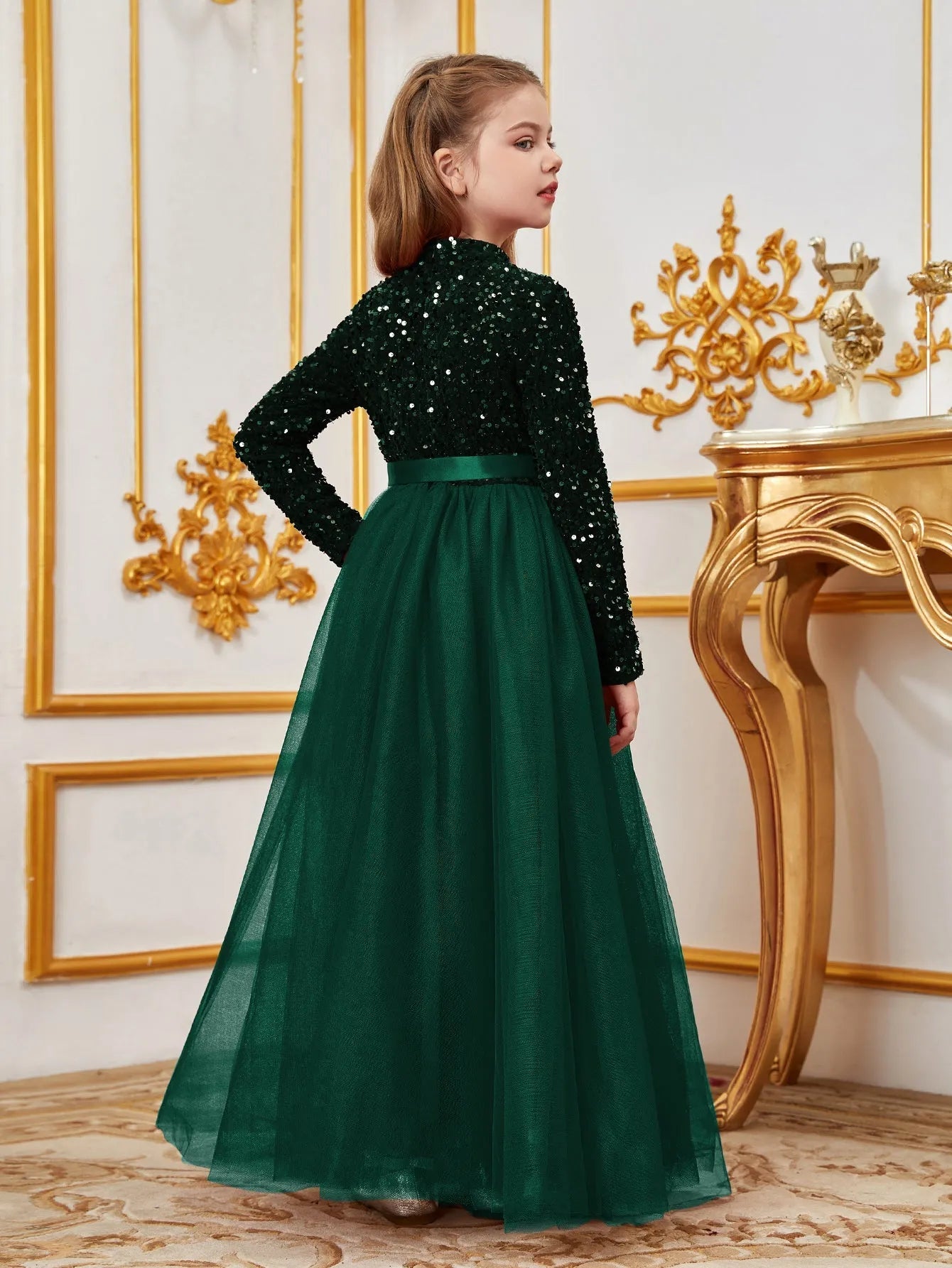 Let your little one shine in our enchanting emerald green gown, perfect for making her feel like a princess. This dress features a beautifully sequined bodice that adds a touch of sparkle and elegance, complemented by long sleeves for a classic look. The satin ribbon belt accentuates the waist, while the flowing tulle skirt creates a dreamy, full-length silhouette that moves gracefully with every step.