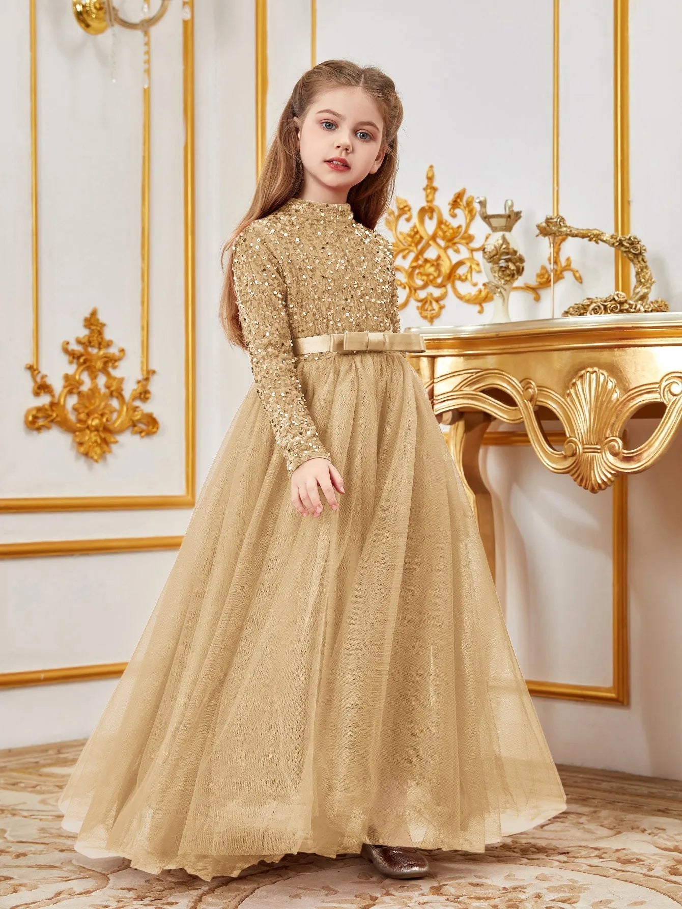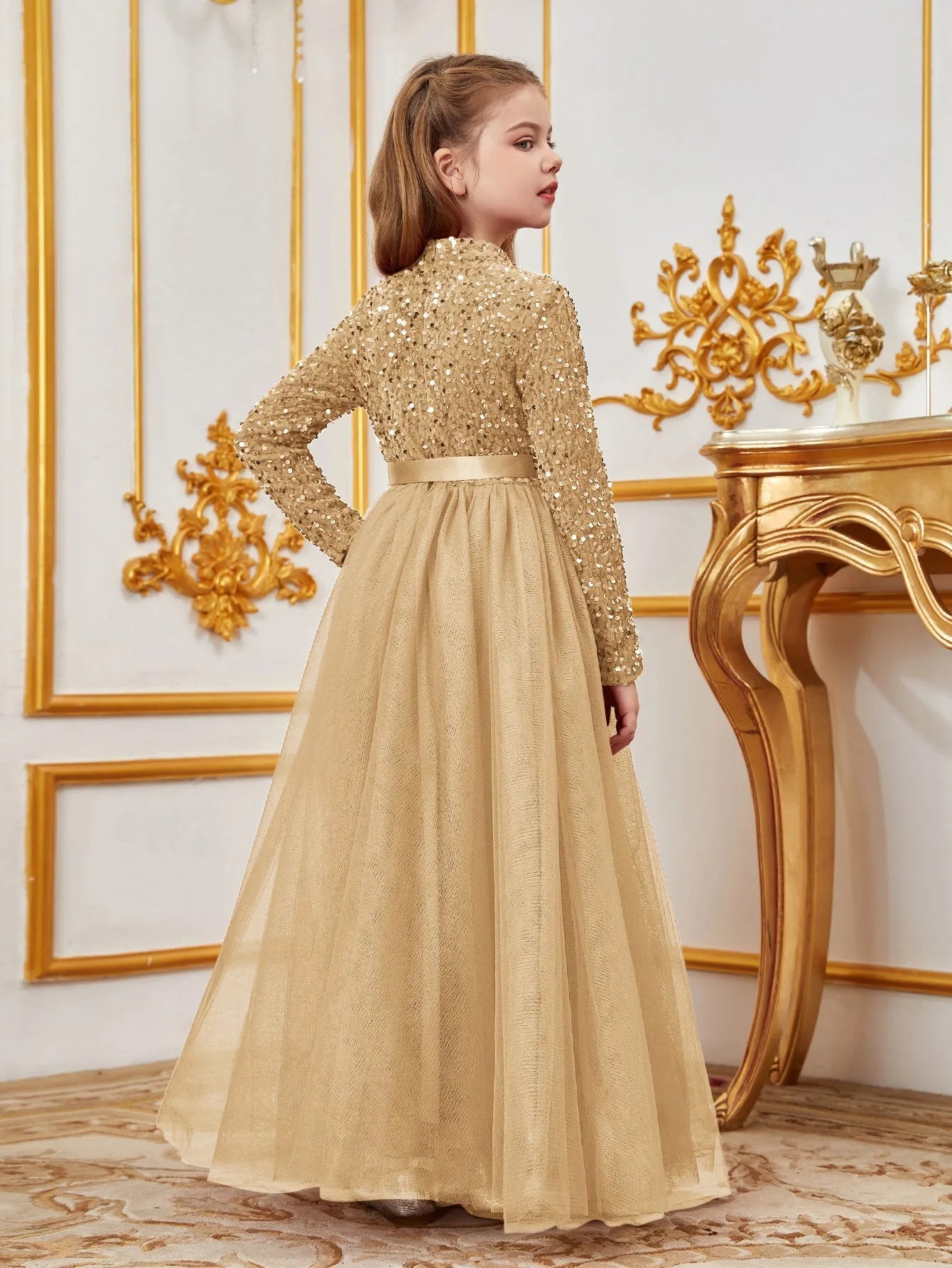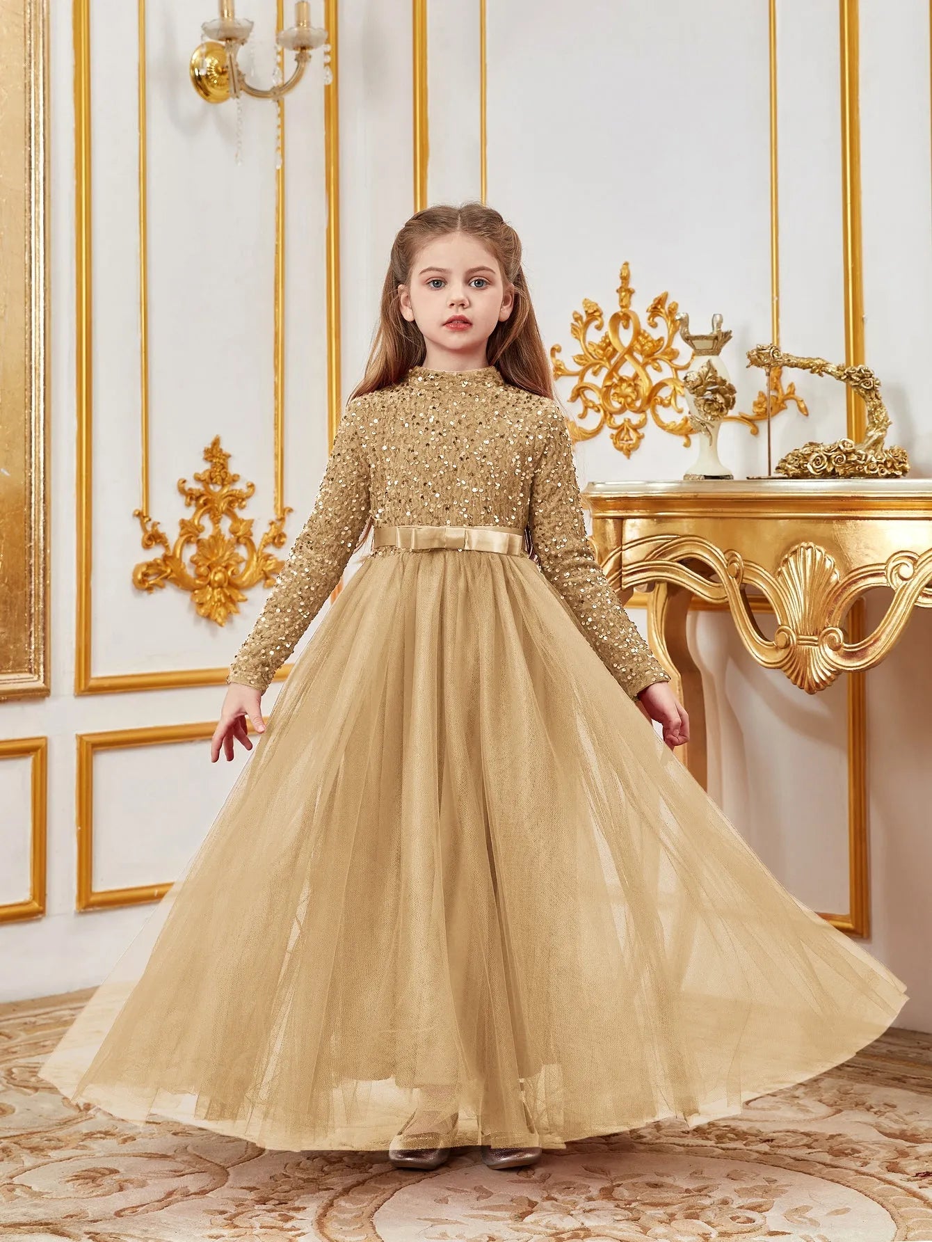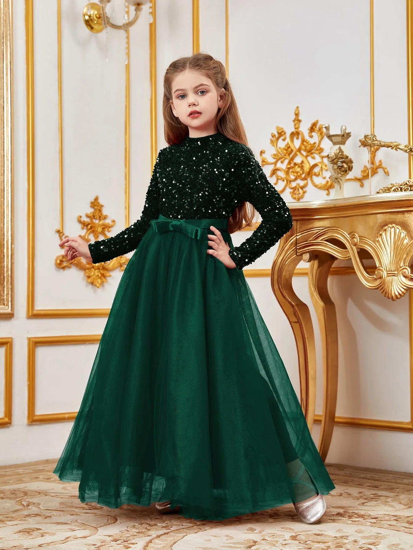 Let your little one shine in our enchanting emerald green gown, perfect for making her feel like a princess. This dress features a beautifully sequined bodice that adds a touch of sparkle and elegance, complemented by long sleeves for a classic look. The satin ribbon belt accentuates the waist, while the flowing tulle skirt creates a dreamy, full-length silhouette that moves gracefully with every step.