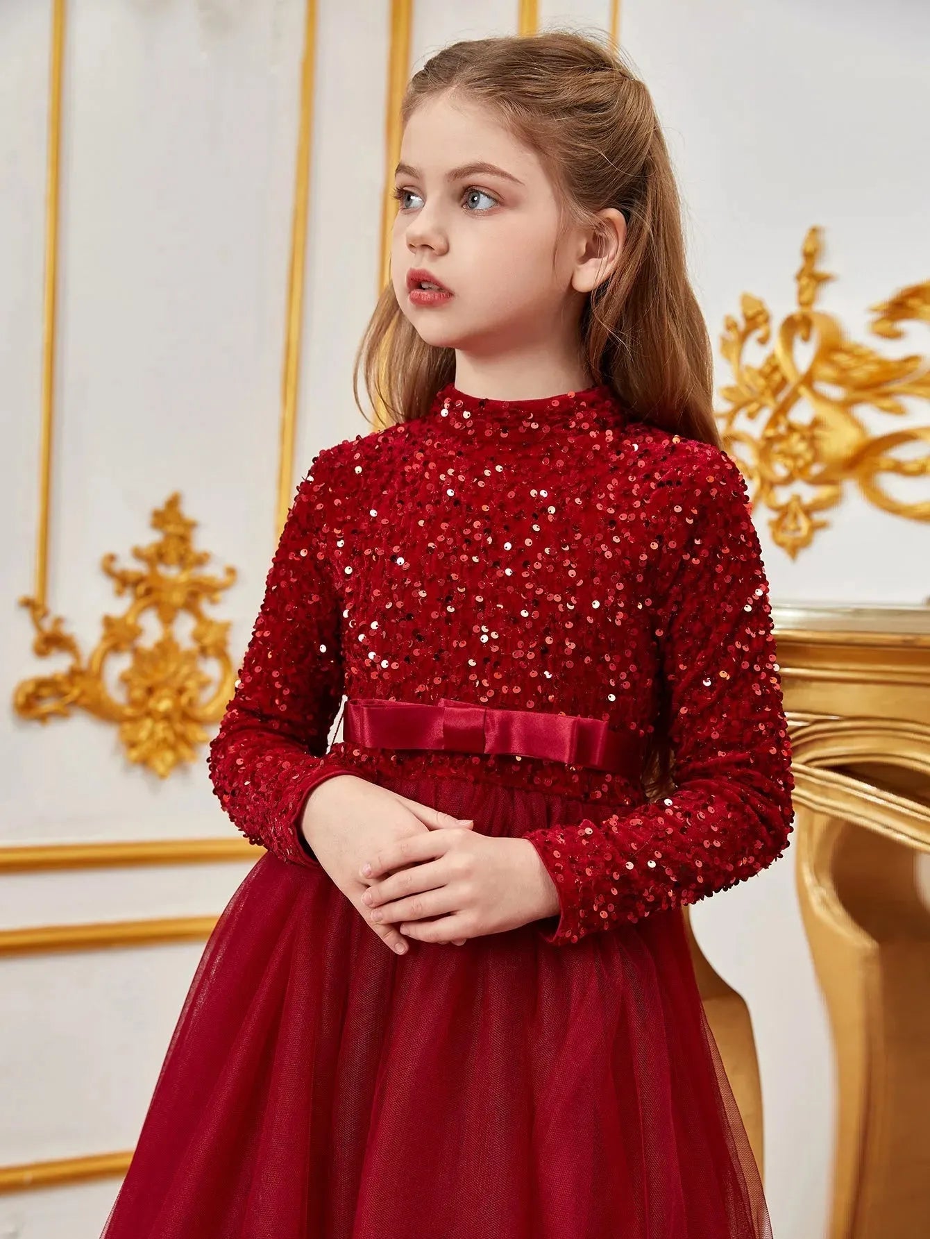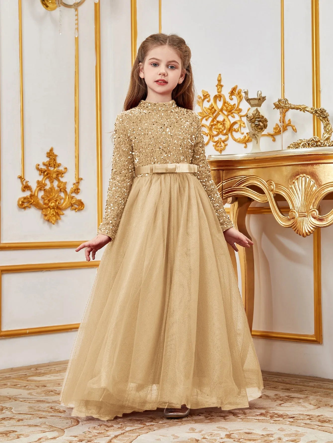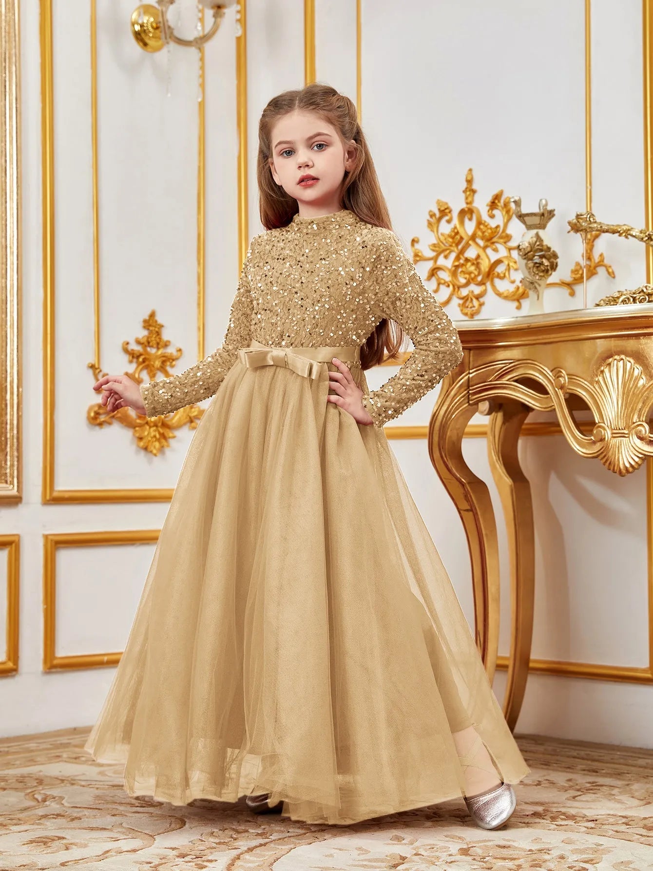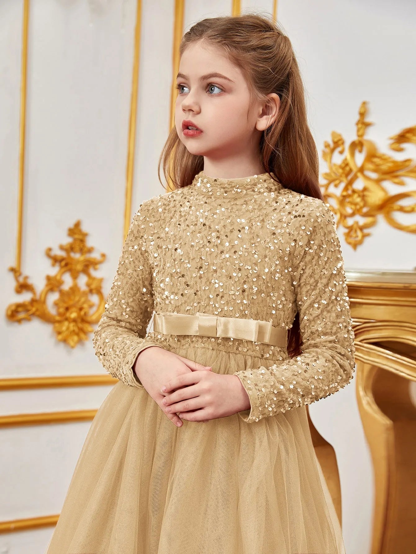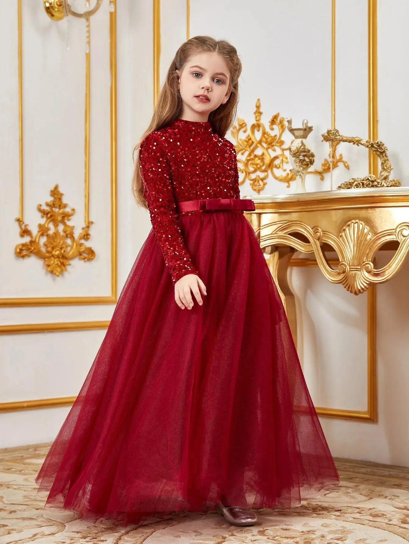 Let your little one shine in our enchanting emerald green gown, perfect for making her feel like a princess. This dress features a beautifully sequined bodice that adds a touch of sparkle and elegance, complemented by long sleeves for a classic look. The satin ribbon belt accentuates the waist, while the flowing tulle skirt creates a dreamy, full-length silhouette that moves gracefully with every step.