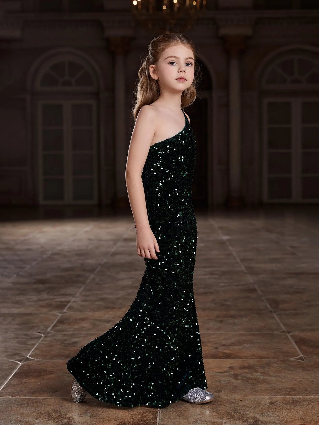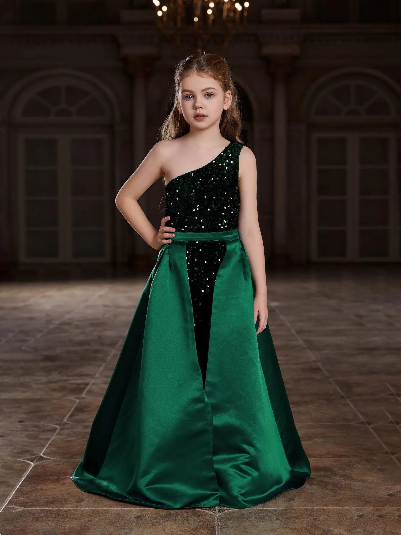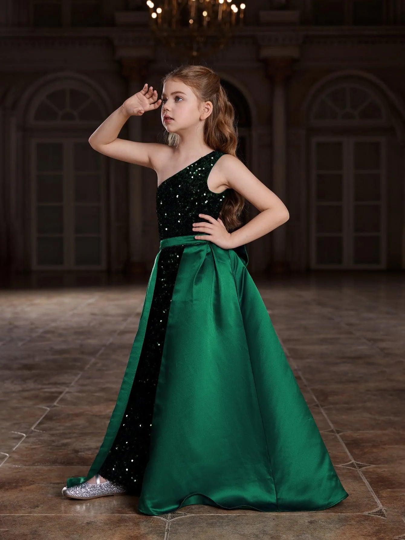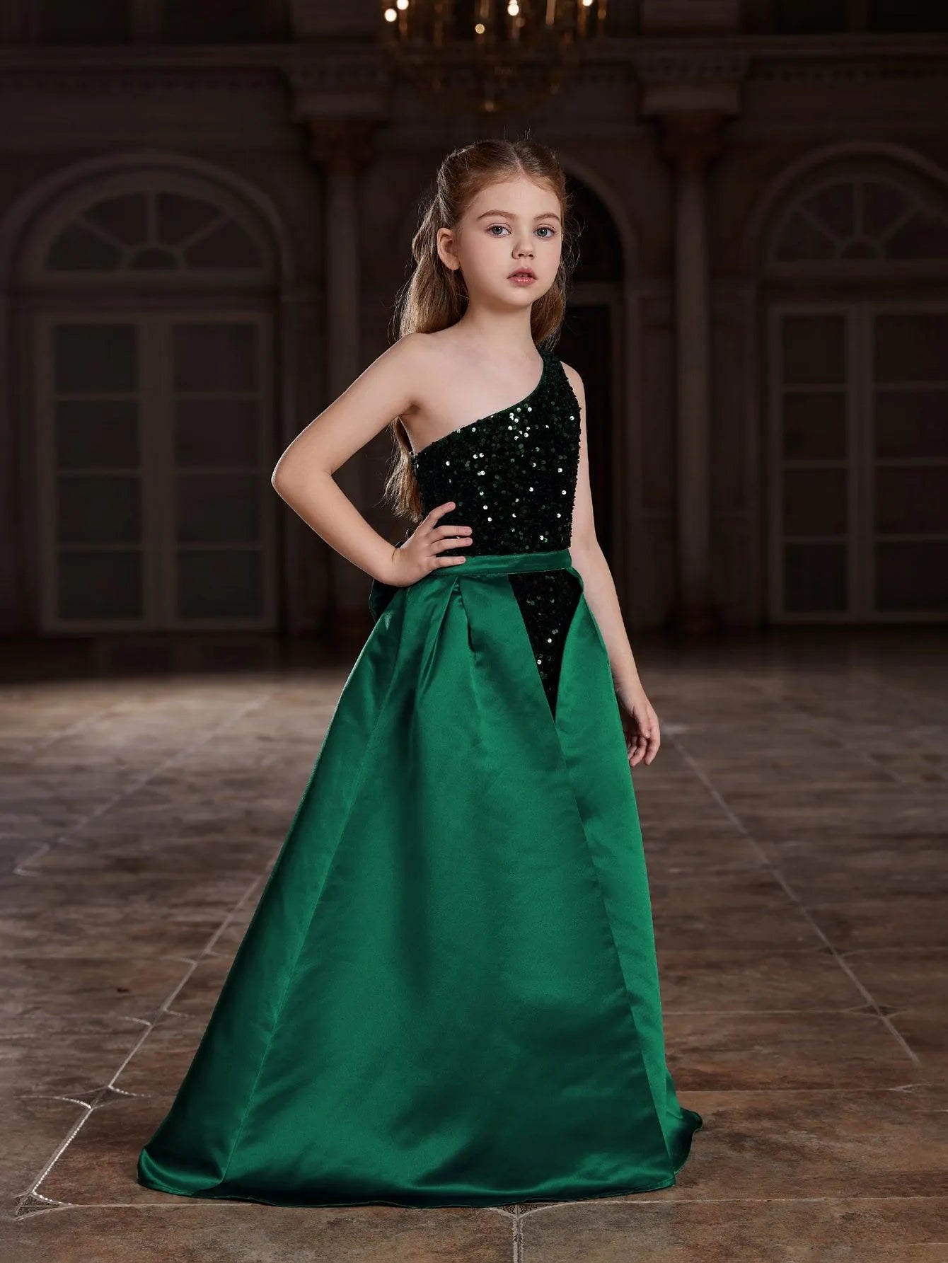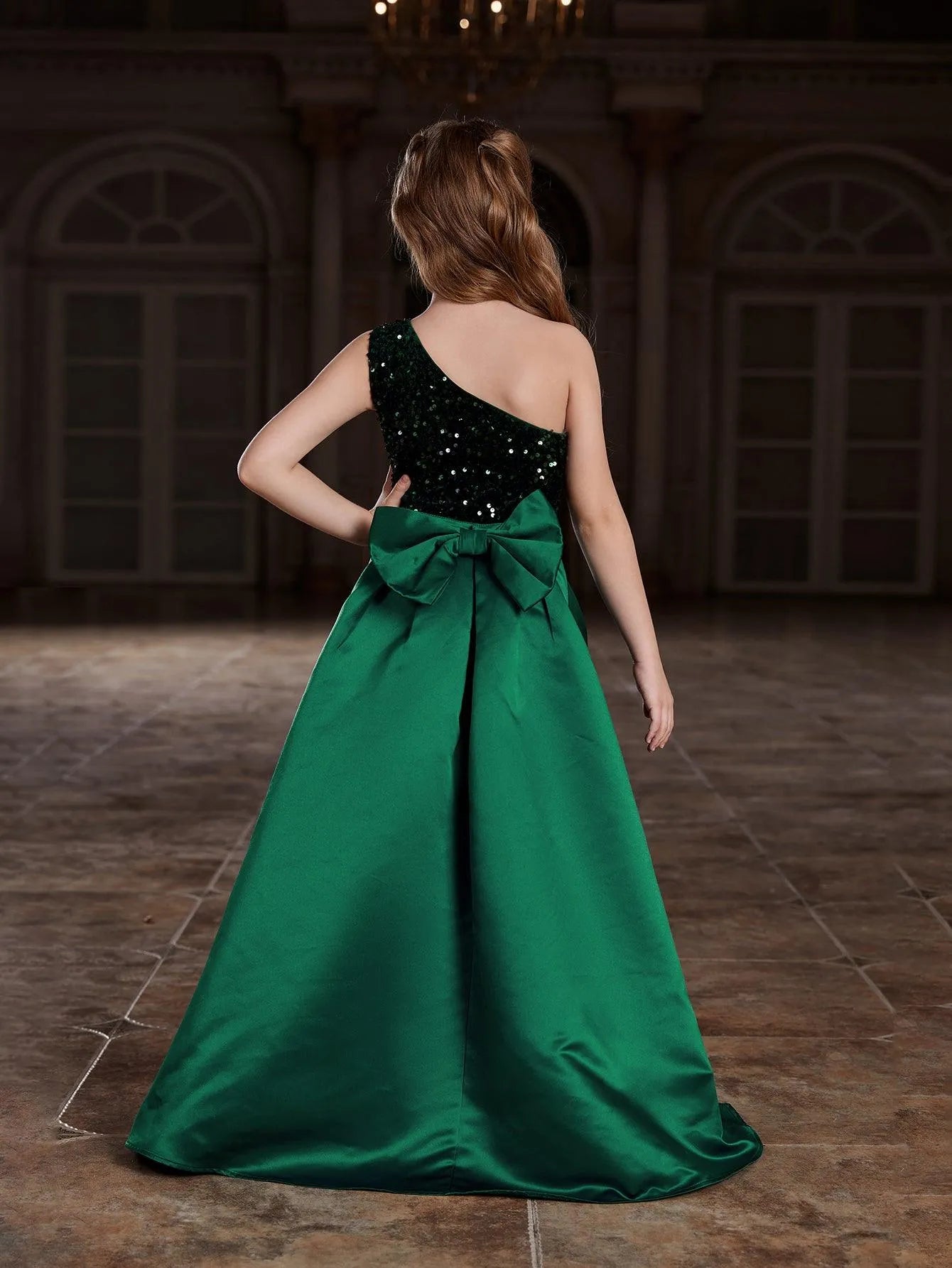 Unveil a world of elegance and charm with this enchanting sequin dress, perfect for making a dazzling statement at any special event. This captivating dress features a one-shoulder design that exudes sophistication, complemented by a striking bow detail at the back, adding a touch of whimsy and grace. The bodice is adorned with shimmering green sequins, creating a mesmerizing effect that catches the light beautifully. The full-length satin skirt flows gracefully, ensuring a timeless and refined silhouette. Ideal for formal occasions, this dress will make any young girl feel like a princess, radiating confidence and style.