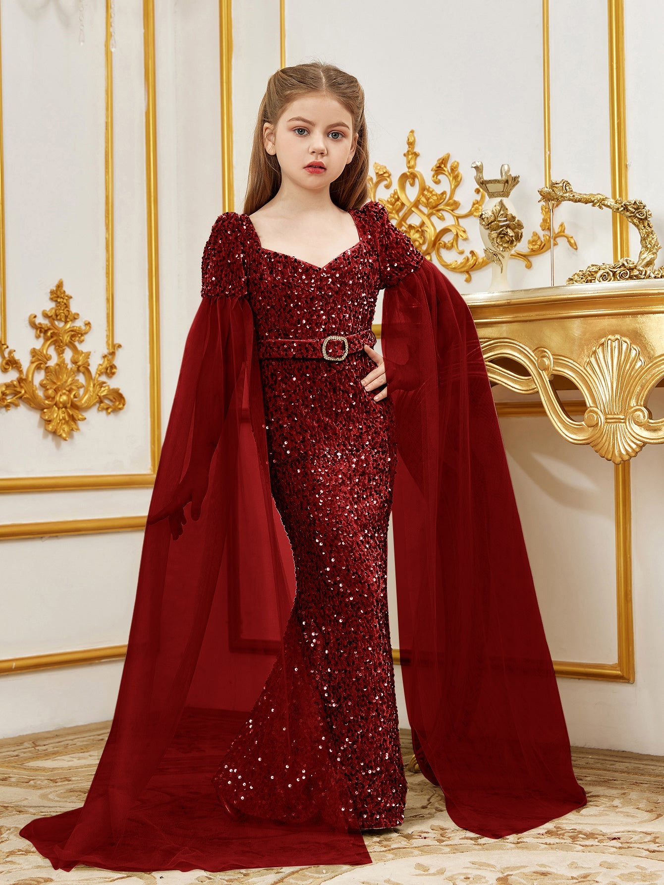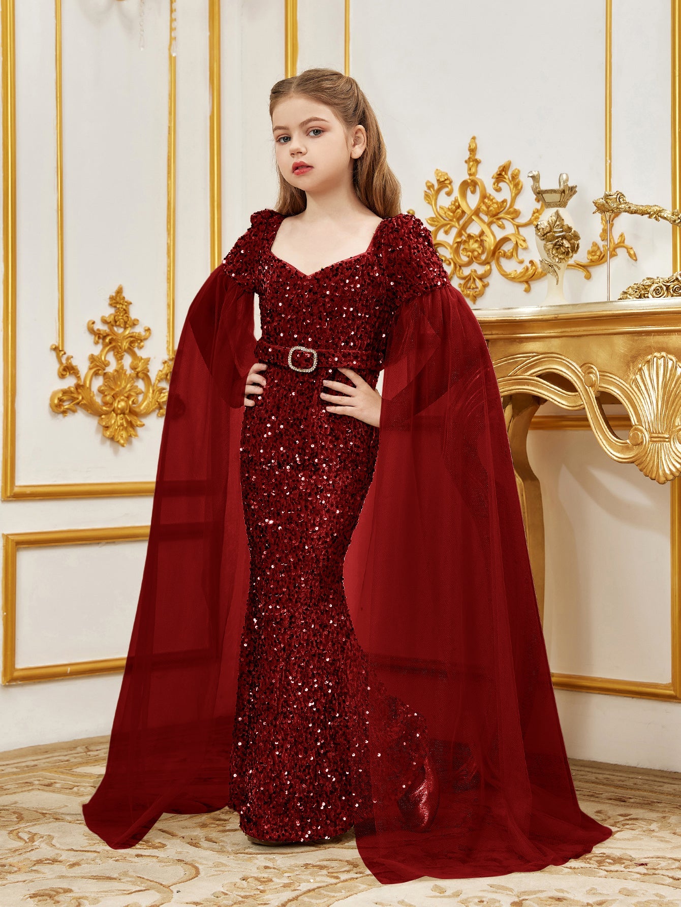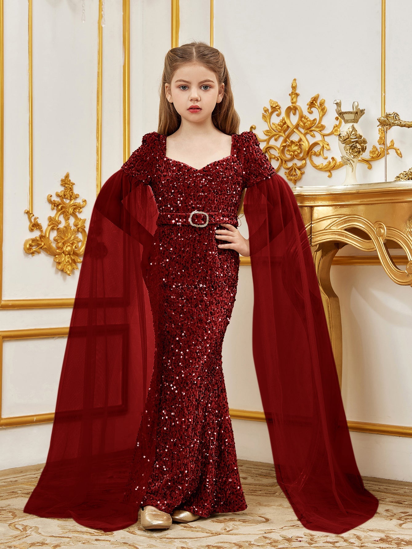 Elevate your little one's elegance with our stunning sequined mermaid gown, perfect for special occasions. The gown features a sweetheart neckline and a fitted silhouette, creating a regal look. The luxurious sequin fabric catches the light, while the flowing chiffon cape adds a touch of fairy-tale magic.