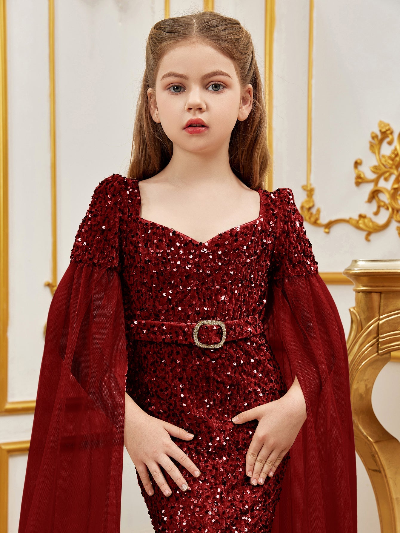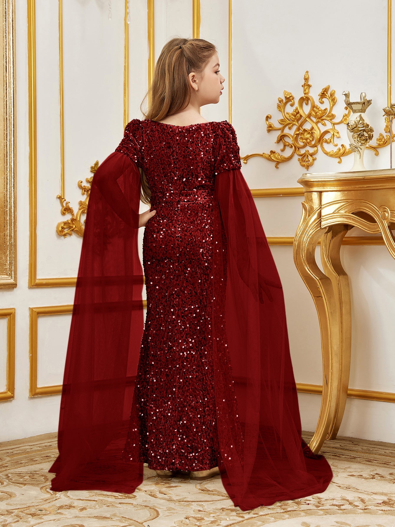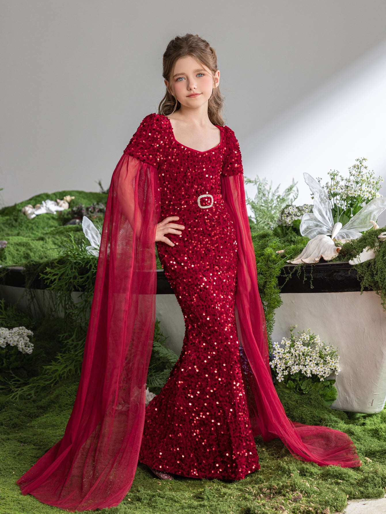 Elevate your little one's elegance with our stunning sequined mermaid gown, perfect for special occasions. The gown features a sweetheart neckline and a fitted silhouette, creating a regal look. The luxurious sequin fabric catches the light, while the flowing chiffon cape adds a touch of fairy-tale magic.