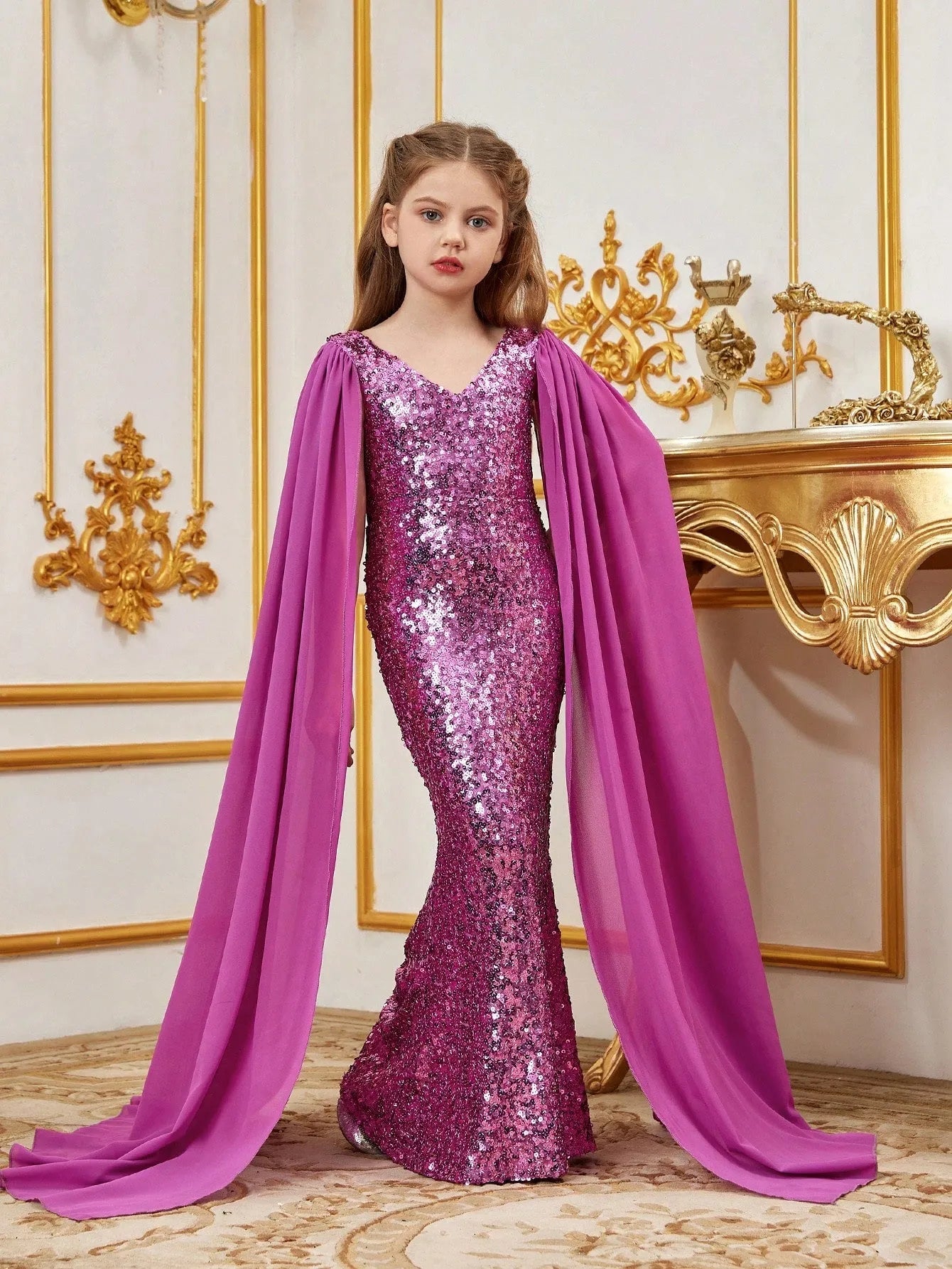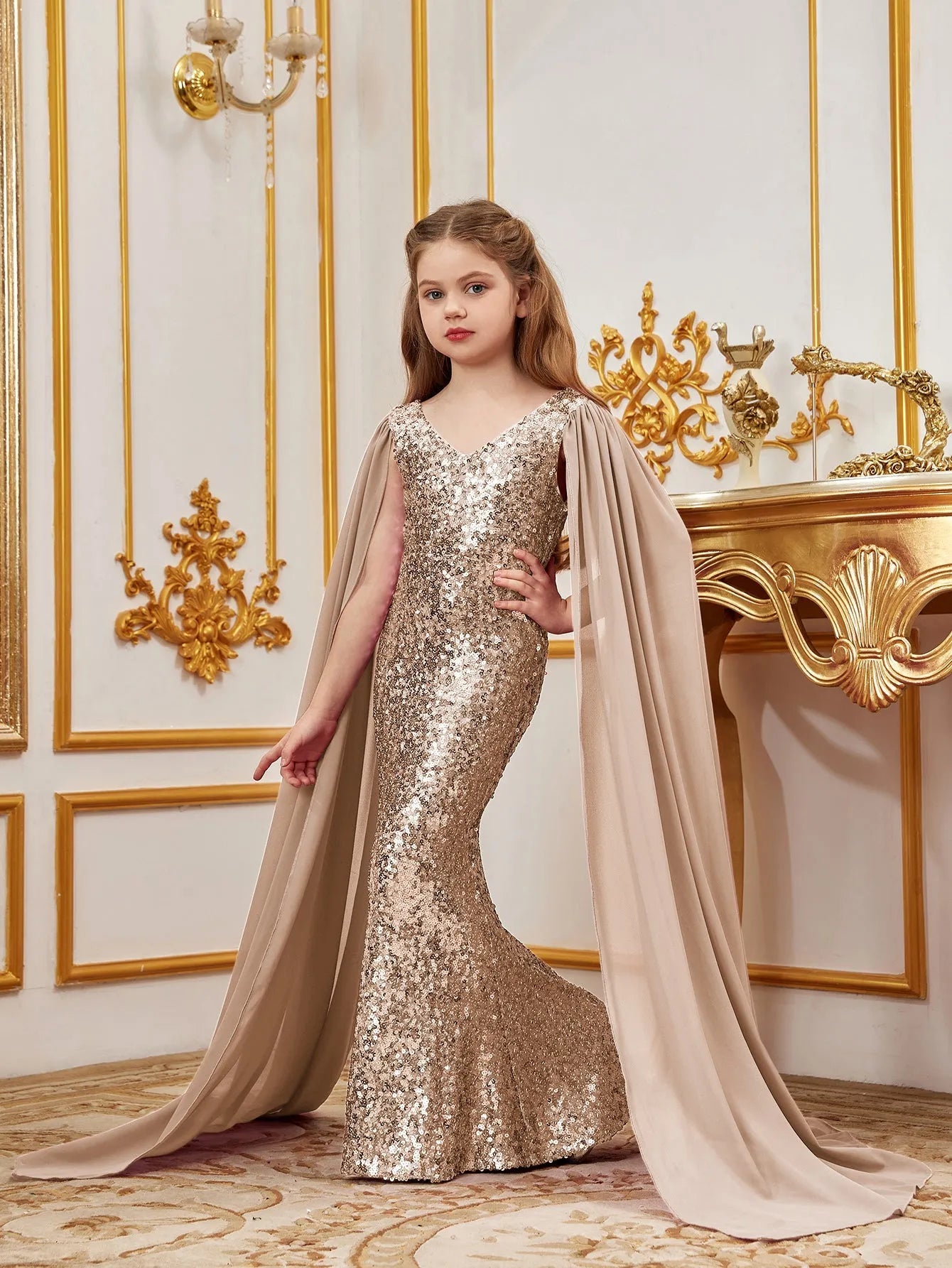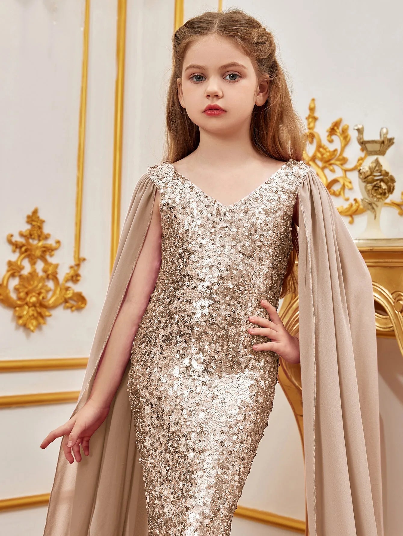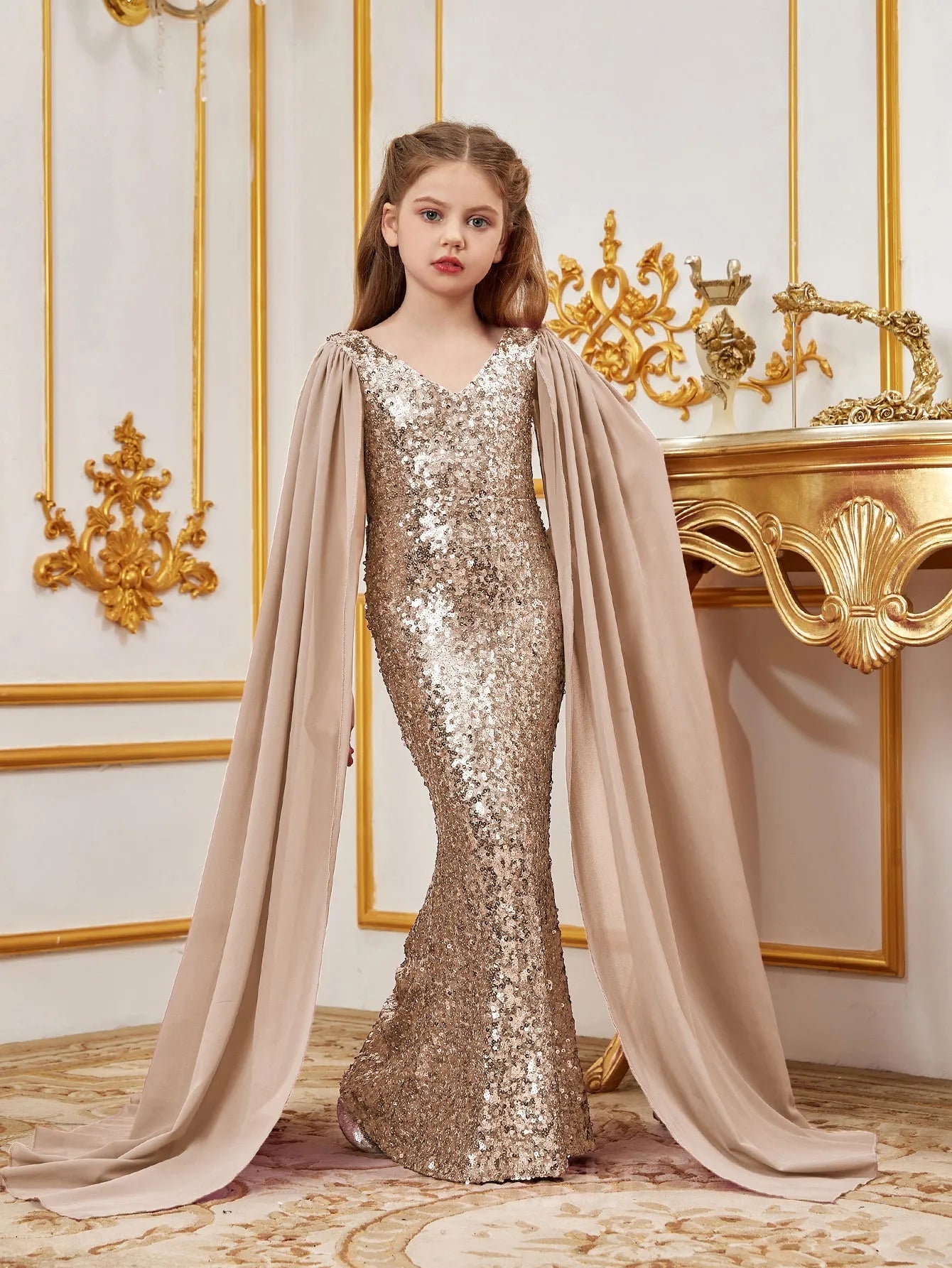 Dress your little one in luxury with our breathtaking sequin gown, perfect for any special occasion where she wants to shine. This gown features a glamorous sequin bodice that glistens with every movement, complemented by a soft chiffon overlay cape that drapes elegantly from the shoulders. The V-neckline and fitted silhouette add a sophisticated touch, while the cape provides a unique, regal flair.