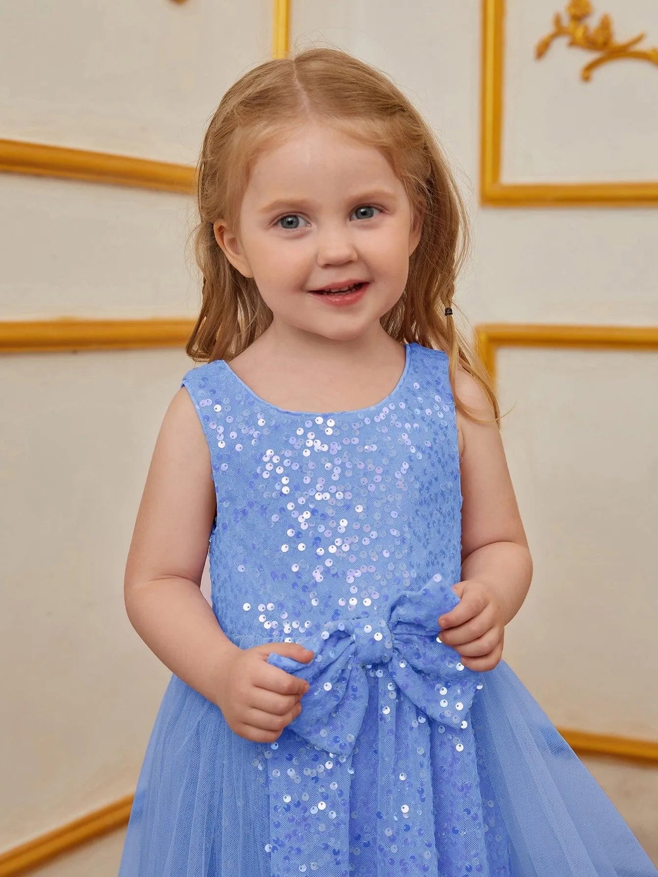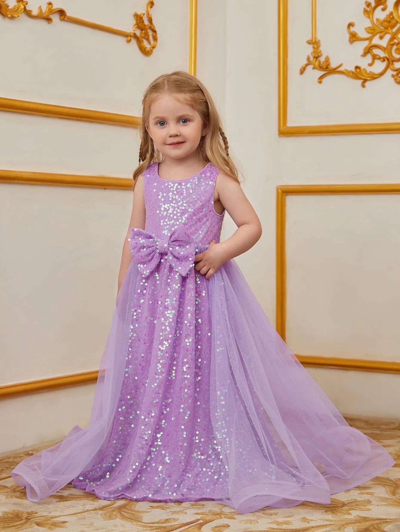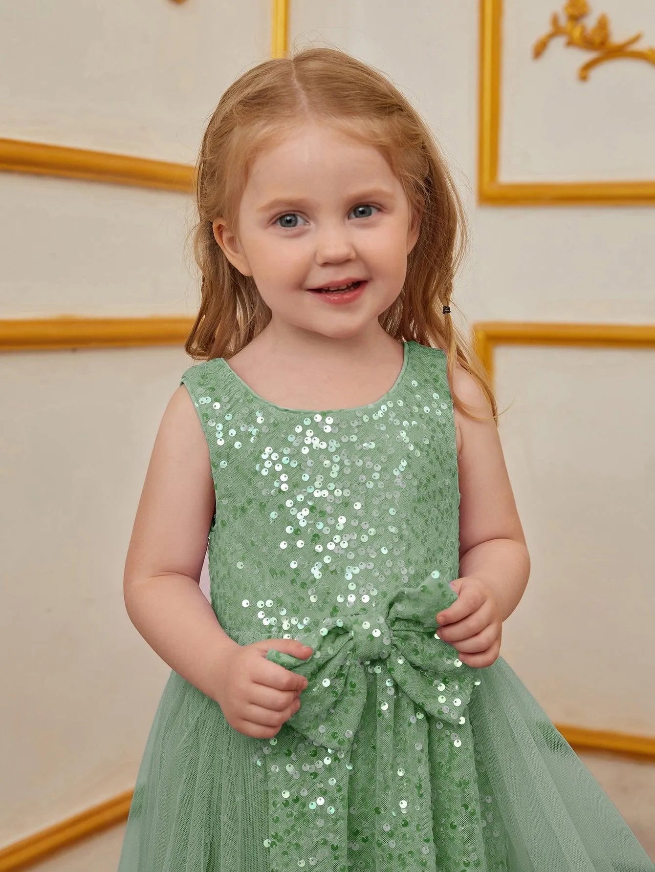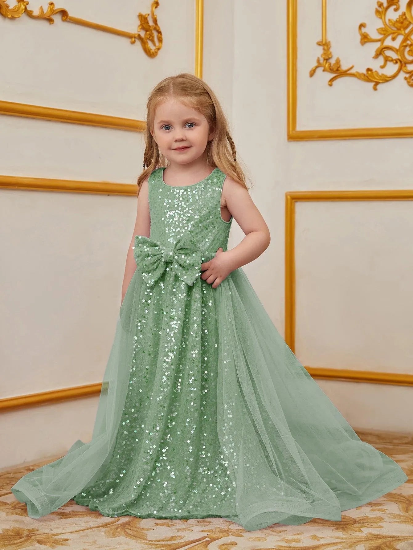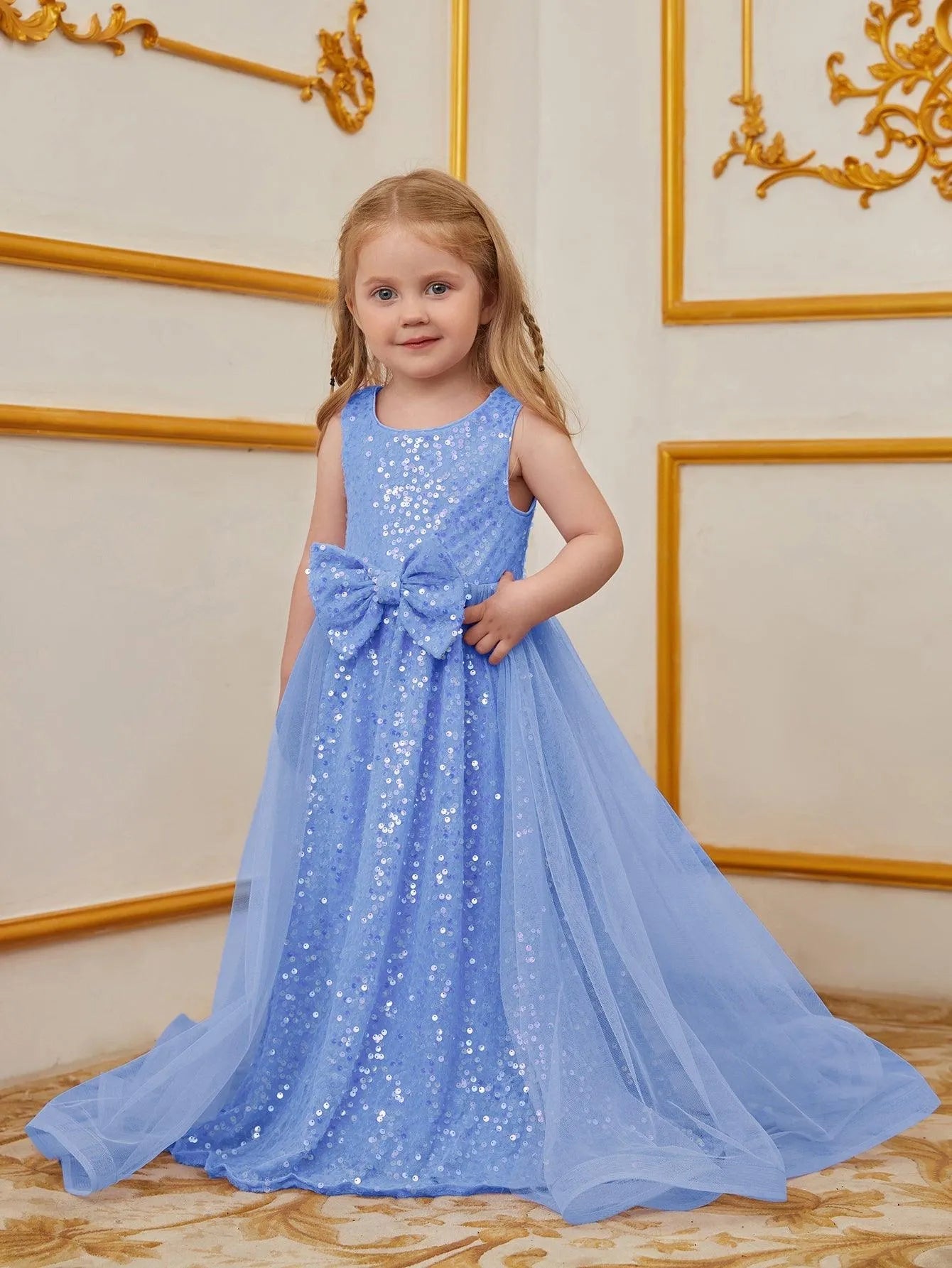 Turn heads at your next event with this enchanting sequin dress for kids. Designed for those who love to make a statement, this dress features a sleeveless bodice adorned with shimmering sequins and a charming bow at the waist. The flowing tulle overlay adds a touch of elegance and whimsy, creating a graceful and timeless silhouette. Ideal for parties, weddings, or any special occasion, this dress exudes an air of classic beauty and charm.