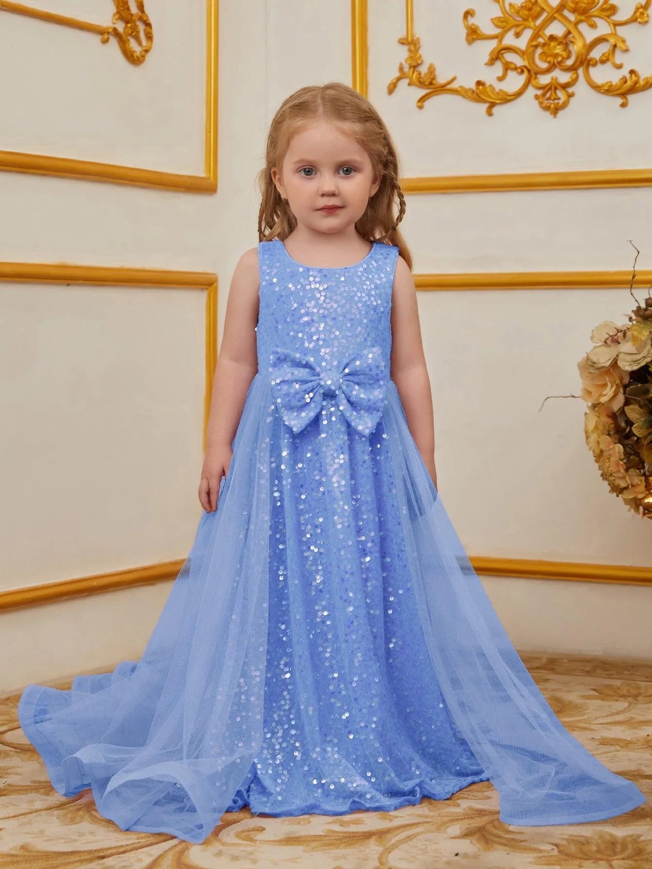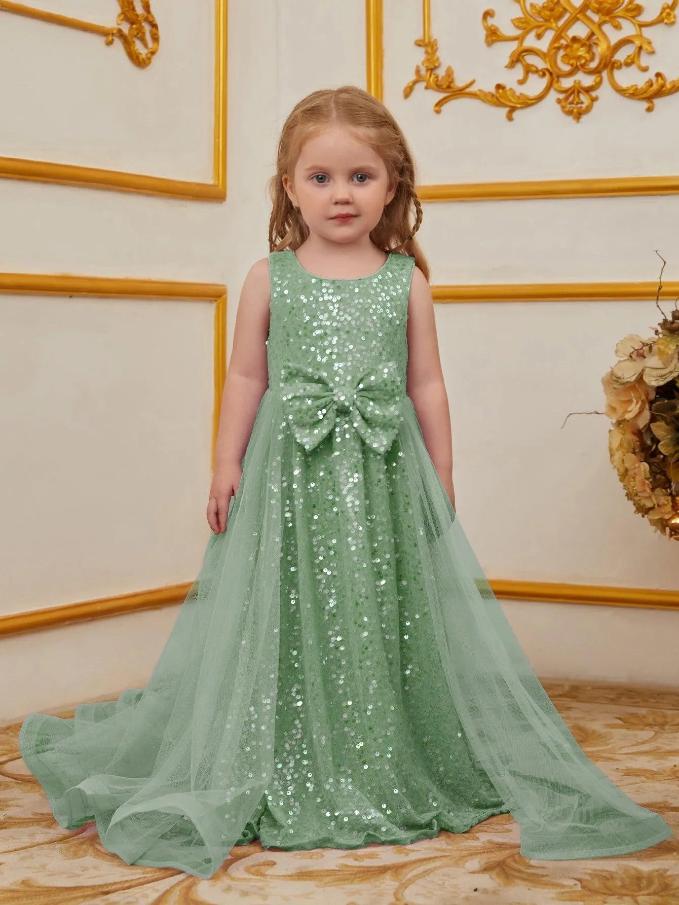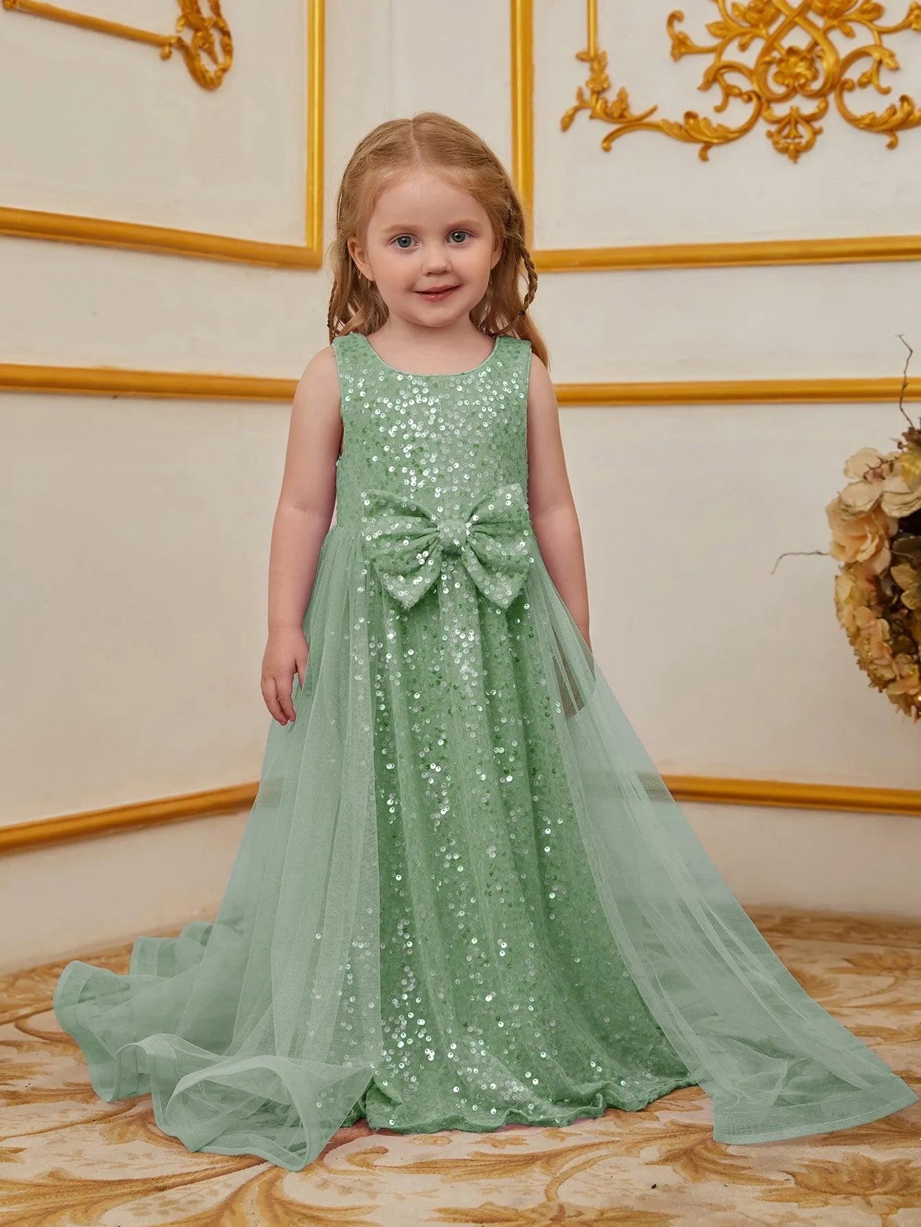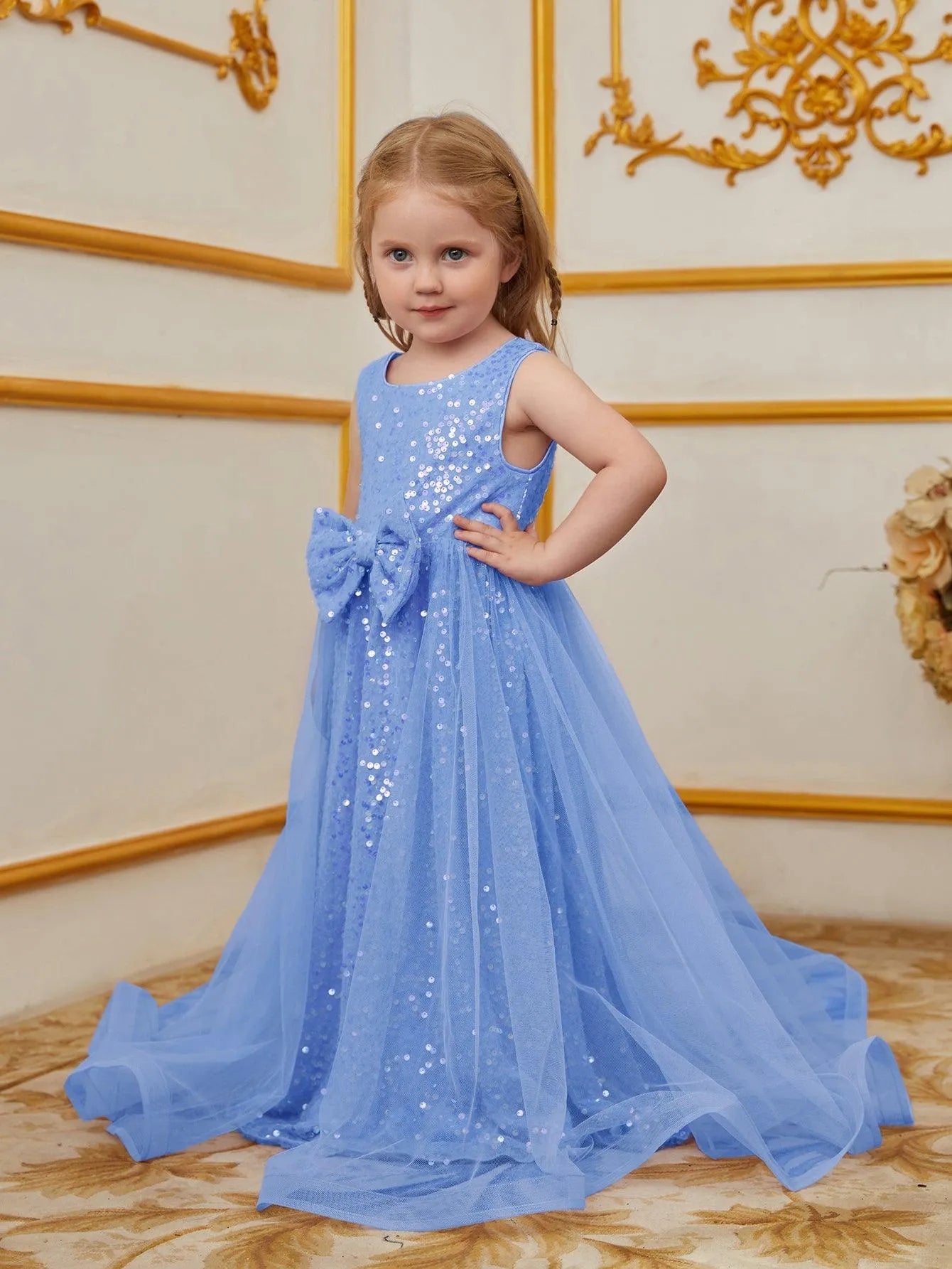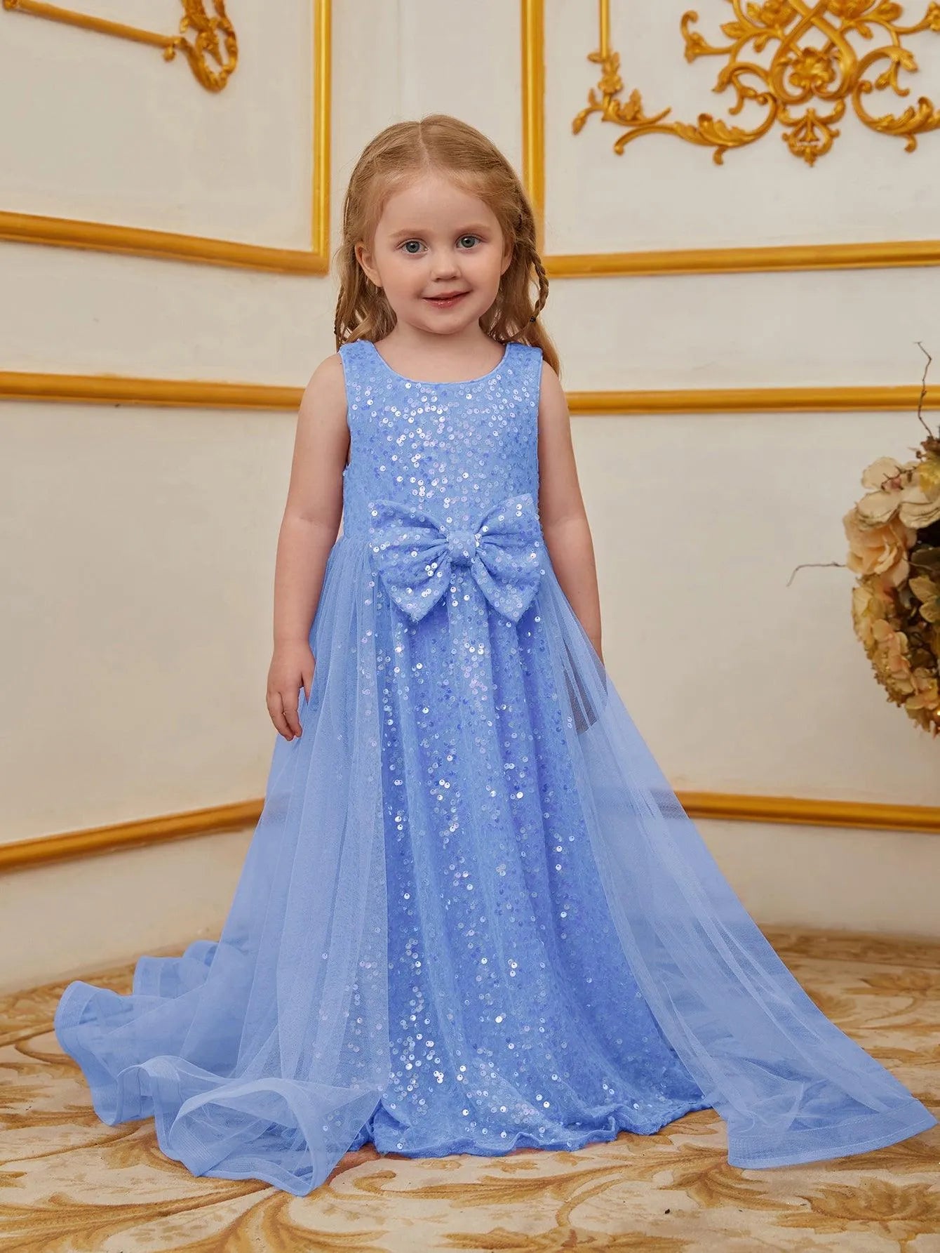 Turn heads at your next event with this enchanting sequin dress for kids. Designed for those who love to make a statement, this dress features a sleeveless bodice adorned with shimmering sequins and a charming bow at the waist. The flowing tulle overlay adds a touch of elegance and whimsy, creating a graceful and timeless silhouette. Ideal for parties, weddings, or any special occasion, this dress exudes an air of classic beauty and charm.